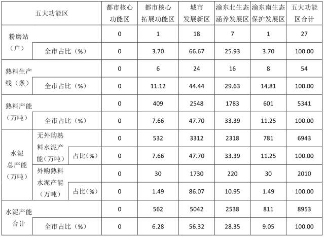 說明:(1)因貫徹落實(shí)渝府發(fā)[2014]24號(hào)文件精神,都市核心功能區(qū)1戶水泥企業(yè)、2條生產(chǎn)線,2016年底政府強(qiáng)行關(guān)閉,故未在統(tǒng)計(jì)數(shù)內(nèi)。(2)水泥產(chǎn)業(yè)布局集中在城市發(fā)展新區(qū)12個(gè)區(qū)縣,符合五大功能區(qū)定位。