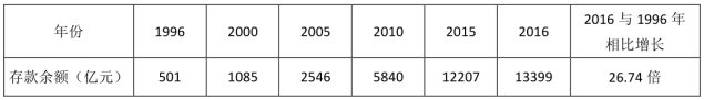 6、2016年城鄉(xiāng)居民人民幣儲(chǔ)蓄存款年末余額是1996年的26.76倍。