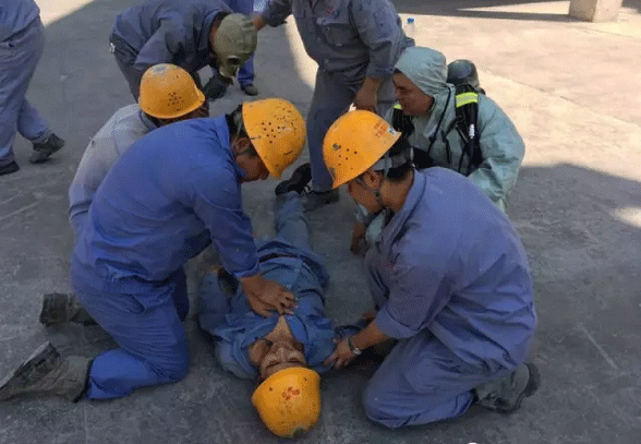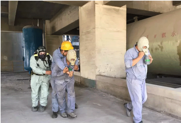熟料分廠廠長(zhǎng)宋杰明擔(dān)任本次應(yīng)急救援演練總指揮,并由救護(hù)組、搶險(xiǎn)組、警戒組、現(xiàn)場(chǎng)清理組和后勤保障組構(gòu)成演練框架。演練模擬一名職工巡檢時(shí)發(fā)現(xiàn)6#氨水罐區(qū)因發(fā)生氨水泄漏導(dǎo)致一人暈倒在地。因情況未明,立即用對(duì)講機(jī)向生產(chǎn)值班長(zhǎng)報(bào)告,接到報(bào)告后,值班長(zhǎng)迅速趕往事故現(xiàn)場(chǎng),由于氨水氣味較濃,無(wú)法近距離查看,初步判斷為現(xiàn)場(chǎng)發(fā)生氨水泄漏。并立即向分廠匯報(bào):宋廠長(zhǎng),6#氨水罐區(qū)發(fā)生氨水泄漏,有一名員工暈倒,因氣味較濃,無(wú)法進(jìn)入施救,請(qǐng)指示。宋廠長(zhǎng)接到報(bào)告后,一邊趕往事故現(xiàn)場(chǎng),一邊通知分廠安全員迅速啟動(dòng)應(yīng)急預(yù)案組織實(shí)施緊急救援。接到通知的各應(yīng)急小組快速在6#窯三檔東側(cè)集合,并在總指揮的統(tǒng)一調(diào)度指揮下迅速展開(kāi)人員疏散、搶救傷員、現(xiàn)場(chǎng)警戒、堵漏搶險(xiǎn)、消防救援等應(yīng)急措施。整個(gè)演練過(guò)程緊張有序,各小組行動(dòng)迅速,對(duì)問(wèn)題處理果斷。最后,現(xiàn)場(chǎng)清理組組長(zhǎng)白海兵向總指揮報(bào)告:總指揮,已對(duì)泄漏氨水進(jìn)行了回收,地面殘留氨水已用消防水進(jìn)行了稀釋中和處置,隱患已消除,請(qǐng)指示??傊笓]:返回原地待命??傊笓]接到各小組組長(zhǎng)完成救援報(bào)告后,命令各小組組長(zhǎng)清點(diǎn)各自人數(shù)。至此,本次應(yīng)急救援任務(wù)圓滿完成。