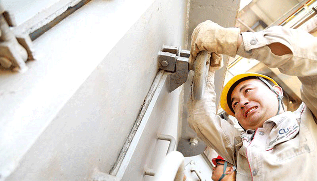 昨日,在位于新安縣產(chǎn)業(yè)集聚區(qū)的新安中聯(lián)水泥有限公司廠區(qū)內(nèi),工人們正對完成提標(biāo)改造的環(huán)保設(shè)備進行復(fù)檢。