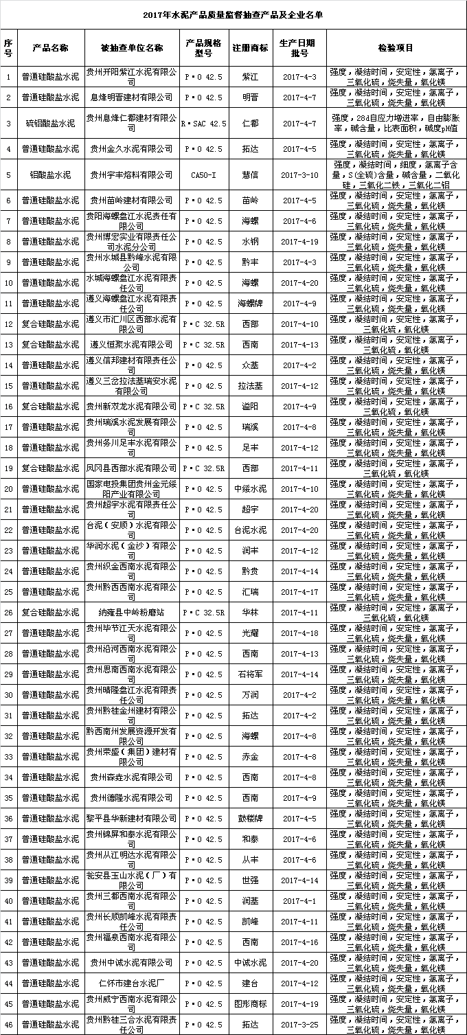 貴州省質(zhì)量技術(shù)監(jiān)督局官網(wǎng)公布2017年水泥產(chǎn)品質(zhì)量監(jiān)督抽查結(jié)果。本次抽查涉及貴陽市、遵義市、六盤水市、安順市、畢節(jié)市、銅仁市、黔東南州、黔南州、黔西南州、仁懷市和威寧縣46家企業(yè)生產(chǎn)的水泥產(chǎn)品46個批次。未檢出問題產(chǎn)品。