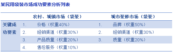 一個(gè)好的競爭戰(zhàn)略是以客戶群體(市場細(xì)分)為基礎(chǔ)的,策略制定人員必須對不同客戶群體需求特征有深刻了解。可以考慮按特定相關(guān)客戶(細(xì)分市場)需求特點(diǎn),分別考慮。譬如民用市場、工業(yè)市場是兩個(gè)基本的市場細(xì)分類型,在民用市場下面,還可以繼續(xù)細(xì)分為農(nóng)村城鎮(zhèn)市場與城市裝修市場,工業(yè)市場也可以細(xì)分為性能驅(qū)動型、價(jià)格驅(qū)動型與關(guān)系驅(qū)動型。在這眾多的客戶類型中,客戶的需求特征是不一樣的,企業(yè)成功要素理所當(dāng)然不一樣。舉例說明水泥企業(yè)民用市場成功要素分析如下: