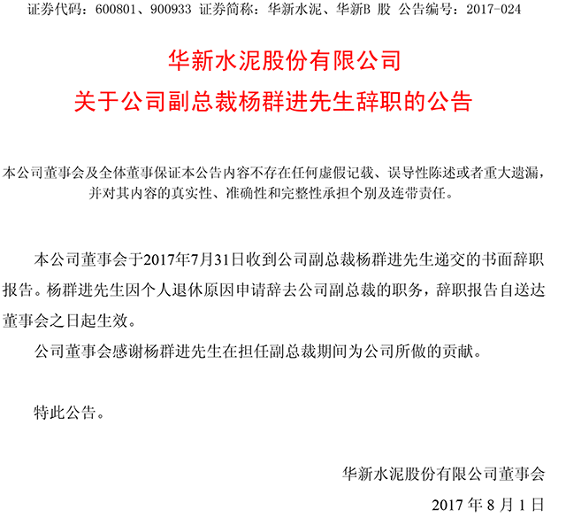 7月31日晚間,華新水泥發(fā)布公告稱,公司董事會于2017年7月31日收到公司副總裁楊群進先生遞交的書面辭職報告。楊群進先生因個人退休原因申請辭去公司副總裁的職務,辭職報告自送達董事會之日起生效。