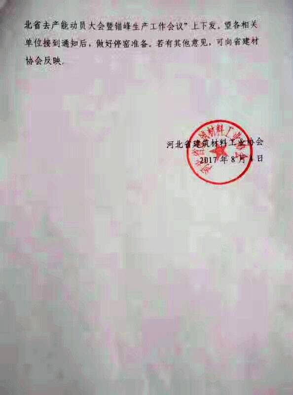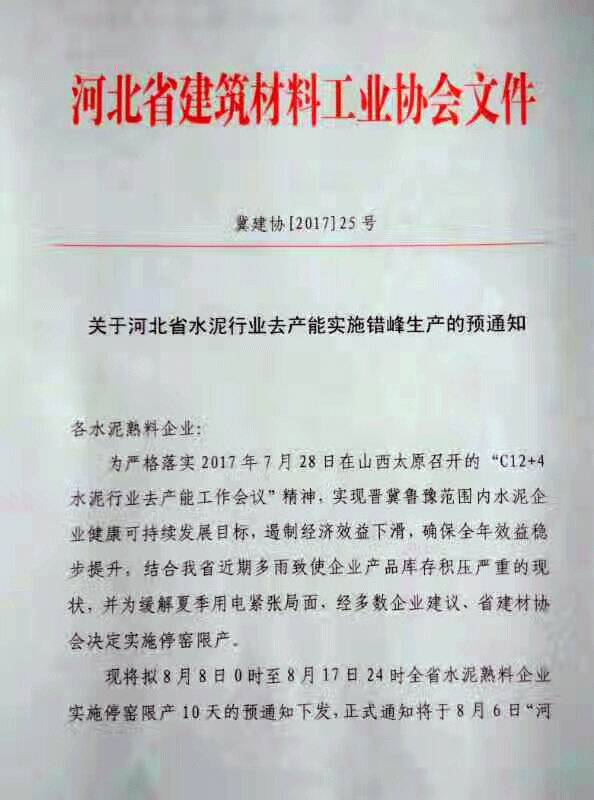 通知稱:為嚴(yán)格落實2017年7月28日在山西太原召開的“C12+4水泥行業(yè)去產(chǎn)能工作會議”精神,實現(xiàn)晉冀魯豫水泥企業(yè)健康可持續(xù)發(fā)展目標(biāo),遏制經(jīng)濟(jì)效益下滑,確保全年效益穩(wěn)步提升,結(jié)合河北省近期多雨致使企業(yè)產(chǎn)品庫存積壓嚴(yán)重的現(xiàn)狀,并為緩解夏季用電緊張局面,經(jīng)多數(shù)企業(yè)建議、河北省建材協(xié)會決定實施停窯限產(chǎn)措施。