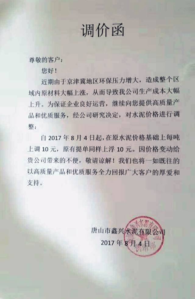 企業(yè)調(diào)價通知稱:由于近期京津冀地區(qū)環(huán)保壓力增大,造成整個區(qū)域內(nèi)原材料大幅上漲,從而導(dǎo)至企業(yè)生產(chǎn)成本大幅上升。為保證企業(yè)良好運營,繼續(xù)向下游客戶提供高質(zhì)量產(chǎn)品和優(yōu)質(zhì)服務(wù),經(jīng)研究決定,對水泥價格進(jìn)行上調(diào)。上調(diào)幅度在10元~30元不等,