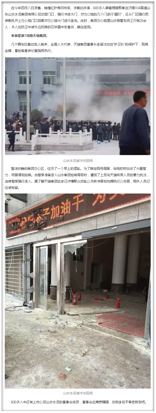 山水水泥(00691)8月8日晚間披露公司最新進(jìn)展,濟(jì)南市政府正協(xié)助公司重組山東山水的董事會及管理層,以解決山東山水前高級管理層非法占領(lǐng)山東山水總部的問題。此外,濟(jì)南市政府正主動鼓勵(lì)公司各方股東以負(fù)責(zé)任的態(tài)度解決糾紛。
