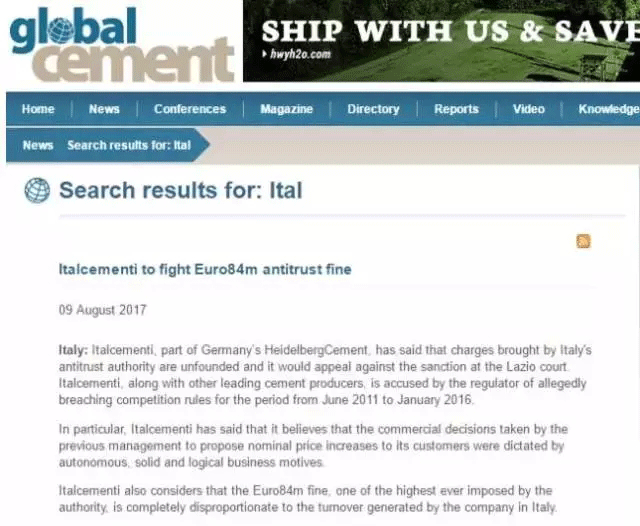 意大利水泥則解釋稱公司此前管理層對他們的客戶提出名義價格上漲的商業(yè)決策是符合自由市場規(guī)則的,是合乎商業(yè)邏輯動機(jī)的。意大利水泥同時還認(rèn)為意大利反壟斷局提出了8000萬歐元的最高反壟斷罰款是和公司的在意大利的營業(yè)額完全不成比例的,過于高昂。