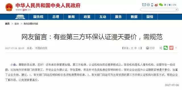 小魚:尊敬的李總理,您好!近年來環(huán)保管理加強(qiáng),第三方檢測、認(rèn)證機(jī)構(gòu)如雨后春筍般成立。有些機(jī)構(gòu)是私人服務(wù)機(jī)構(gòu),運(yùn)營存在一些問題:比如地方環(huán)保部門的原職工,開設(shè)企業(yè)辦理認(rèn)證,存在壟斷,而且針對各類檢測沒有明碼標(biāo)價。有時企業(yè)會因?yàn)檎J(rèn)證期限緊被漫天要價,加重了企業(yè)負(fù)擔(dān)。建議:1、有關(guān)部門網(wǎng)站應(yīng)明碼標(biāo)價各項(xiàng)檢測費(fèi)用標(biāo)準(zhǔn)。2、有關(guān)部門網(wǎng)站可列出有資質(zhì)的第三方環(huán)保認(rèn)證機(jī)構(gòu)與聯(lián)系方式,幫助企業(yè)了解市場,以免被索要高價。