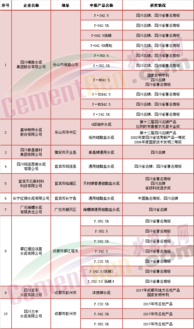 四川省省級(jí)名優(yōu)水泥產(chǎn)品匯總表