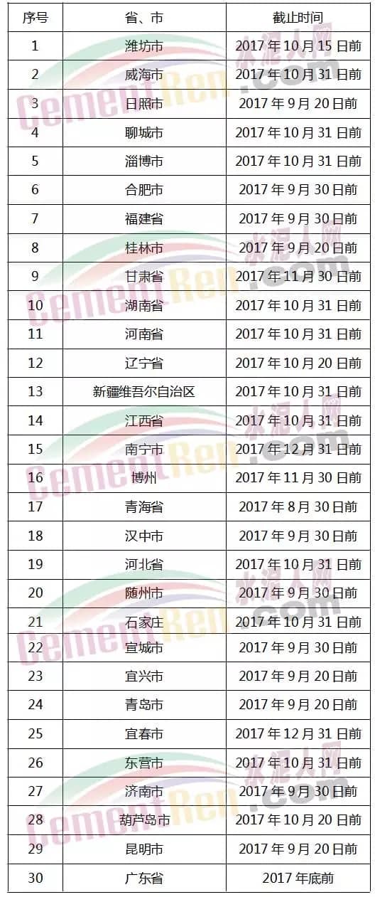 根據(jù)國務(wù)院辦公廳《控制污染物排放許可制實(shí)施方案》(國辦發(fā)〔2016〕81號)、環(huán)保部《排污許可證管理暫行規(guī)定》(環(huán)水體〔2016〕186號,以下簡稱《暫行規(guī)定》)和《固定污染源排污許可分類管理名錄》(2017年版)等要求,全國各省、市、區(qū)將對鋼鐵、水泥企業(yè)發(fā)布排污許可證,水泥人網(wǎng)將全國30個(gè)省市區(qū)許可證申請時(shí)間表整理如下: