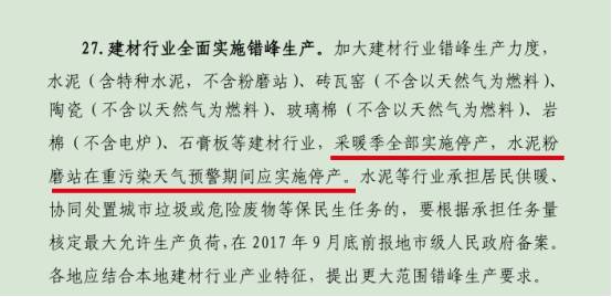 【水泥人網(wǎng)】近日,環(huán)保部發(fā)布《京津冀及周邊地區(qū)2017-2018 年秋冬季大氣污染綜合治理攻堅(jiān)行動(dòng)方案》,2017年10月至2018年3月,水泥(含特種水泥,不含粉磨站)、磚瓦窯(不含以天然氣為燃料)、陶瓷(不含以天然氣為燃料)、玻璃棉(不含以天然氣為燃料)、巖棉(不含電爐)、石膏板等建材行業(yè),采暖季全部實(shí)施停產(chǎn),水泥粉磨站在重污染天氣預(yù)警期間應(yīng)實(shí)施停產(chǎn)。