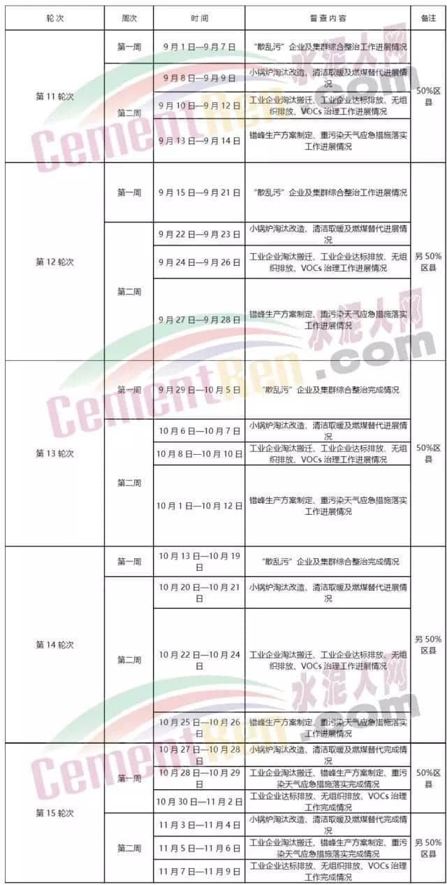 第一階段(2017 年 9 月 1 日至 11 月 9 日),共 5 個輪次(第 11至 15 輪次)70 天,重點對“2+26”城市所有縣(區(qū))全部 12 項任務(wù)完成情況、各項減排措施的落實情況、任務(wù)清單外的涉氣類突出問題以及《攻堅方案》中“2+26”城市的其他大氣污染綜合治理任務(wù)進行督查(具體安排見附 2)。