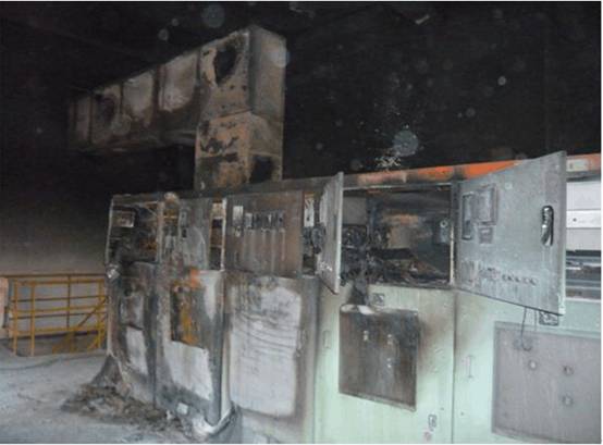 火被撲滅后檢查發(fā)現(xiàn):6kV開關(guān)室Ⅰ段母排上的母聯(lián)柜、1#發(fā)電機(jī)并網(wǎng)柜、所用變柜及Ⅱ段母排上的快速開關(guān)柜、PT柜、2#主變進(jìn)線柜已徹底燒毀,6kV兩段間母線橋徹底燒毀坍塌,其余20臺(tái)開關(guān)柜均受到短路電流的沖擊和短路時(shí)的電弧熏燒、二次部分基本燒毀、柜體和手車絕緣基本被破壞,同時(shí)總降6kV室也遭受到較嚴(yán)重?fù)p壞,內(nèi)部墻壁粉刷脫落,部分玻璃破碎。