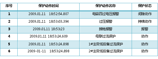 一層6kV開關(guān)室內(nèi)保護(hù)設(shè)備基本燒毀,二層監(jiān)控室內(nèi)保護(hù)屏及監(jiān)控計(jì)算機(jī)完好,計(jì)算機(jī)恢復(fù)上電后,監(jiān)控?cái)?shù)據(jù)完整記錄了整個(gè)事故發(fā)生過程。保護(hù)裝置記錄的數(shù)據(jù)如下: