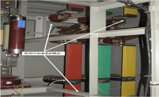 一層6kV開關(guān)室Ⅱ段母排上快速開關(guān)柜(含隔離刀)損壞最為嚴(yán)重,快速開關(guān)的下樁頭與隔離刀連接母排全部熔融,C相母排不復(fù)存在,柜體前門、側(cè)護(hù)板全部炸飛。 因短路爆炸產(chǎn)生了巨大的沖擊力和高溫,現(xiàn)場(chǎng)環(huán)境及元器件均遭破壞。由于快速開關(guān)柜內(nèi)連接母排存在設(shè)計(jì)不規(guī)范(母排塑封不完整,柜內(nèi)母排、開關(guān)、相間和二次控制之間未隔離,熔斷器固定不可靠),特別是無(wú)泄壓通道,避雷器安裝在靠近水平母排下方,存在較為嚴(yán)重的安全隱患。