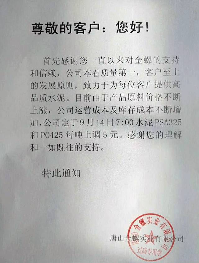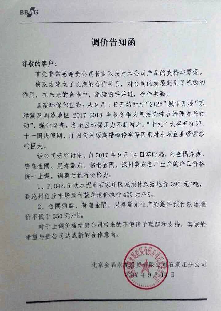 北京金隅水泥經(jīng)貿(mào)有限公司石家莊分公司調(diào)價(jià)告知函原文如下: