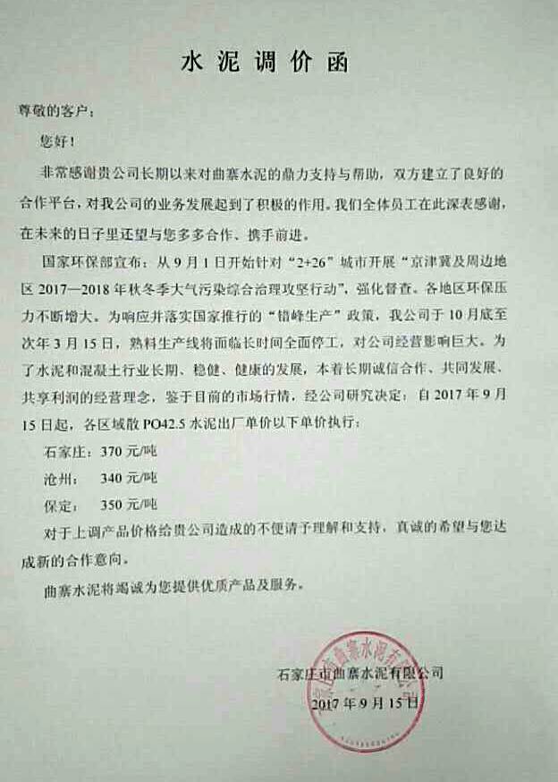 石家莊曲寨水泥的調(diào)價(jià)通知稱:國(guó)家環(huán)保部宣布從9月1日開始針對(duì)“2+26”城市開展“京津冀及周邊地區(qū)2017-2018年秋冬季大氣污染綜合治理攻堅(jiān)行動(dòng)”,強(qiáng)化督查。各地區(qū)環(huán)保壓力不斷增大。