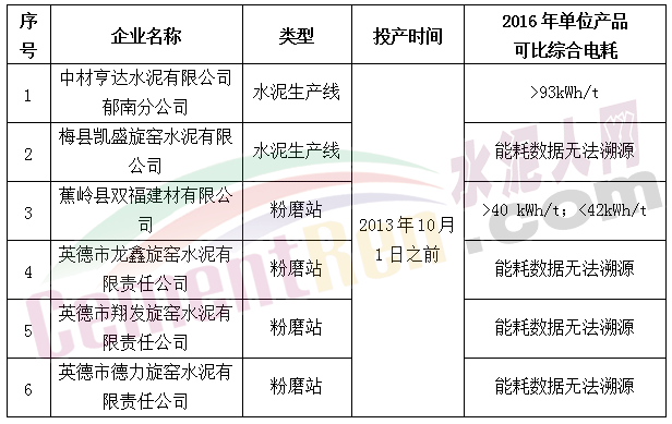 根據(jù)核查及復(fù)核結(jié)果,6家水泥企業(yè)產(chǎn)品可比綜合電耗超過國(guó)家限額標(biāo)準(zhǔn)或能耗數(shù)據(jù)無法溯源,現(xiàn)將6家企業(yè)名單及其2016年單位產(chǎn)品可比綜合電耗核查情況予以公布。