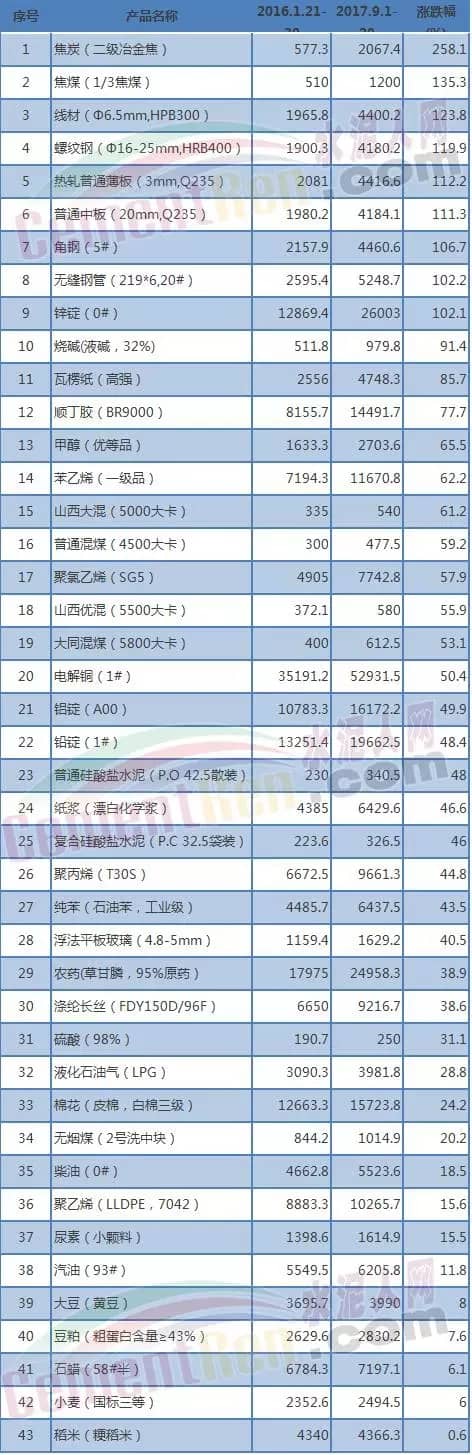 從國(guó)家統(tǒng)計(jì)局發(fā)布的相關(guān)數(shù)據(jù)來(lái)看,自2016年初以來(lái),大部分產(chǎn)品價(jià)格都出現(xiàn)了不同程度上漲,其中漲幅最大的是焦炭(二級(jí)冶金焦),漲幅達(dá)258.1%。由此可以看出,在目前的經(jīng)濟(jì)環(huán)境之下,并不是水泥在漲,而是各個(gè)領(lǐng)域的大宗商品都在漲。