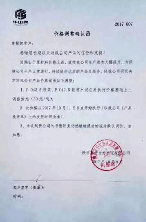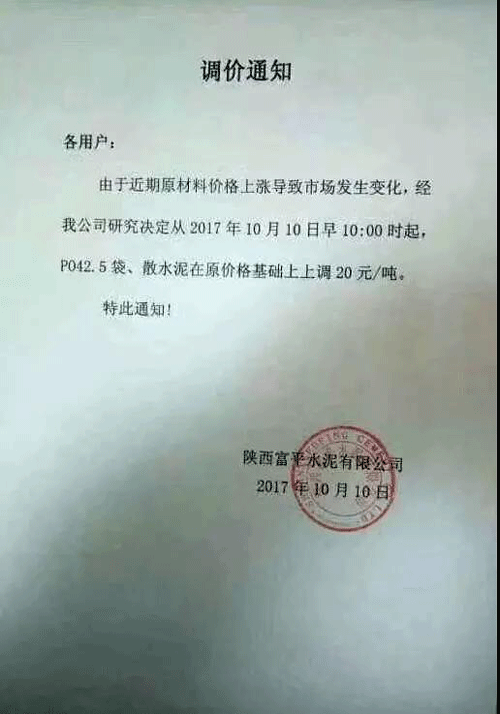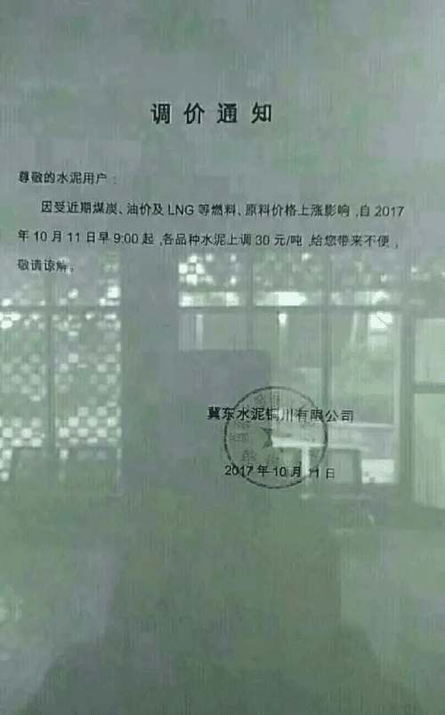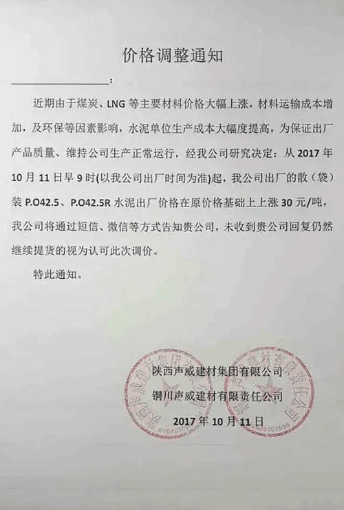 說到水泥價(jià)格,不能不提水泥的上游產(chǎn)品煤炭,陜西水泥企業(yè)的調(diào)價(jià)通知稱:“由于煤碳、LNG等主要材料價(jià)格大幅上漲,材料運(yùn)輸成本增加及環(huán)保等因素影響,水泥單位生產(chǎn)成本大幅提高,為保證出廠產(chǎn)品質(zhì)量、維持公司生產(chǎn)正常運(yùn)行,經(jīng)公司研究決定從2017年10月11日早9時(shí)起,公司出廠的散(袋)裝P.O42.5、P.O42.5R水泥出廠價(jià)格在原價(jià)格基礎(chǔ)上上漲30元/噸。”