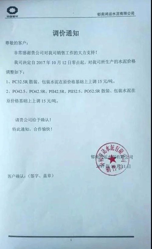 昨日(11日)珠三角多家企業(yè)發(fā)布提價(jià)通知稱水泥出廠價(jià)在原基礎(chǔ)上提高了15元/噸;陜西地區(qū)多家企業(yè)也于昨日發(fā)布價(jià)格調(diào)整通知,水泥價(jià)格在原基礎(chǔ)上上調(diào)30元/噸。