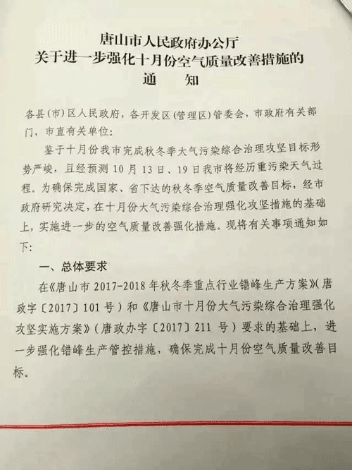 昨日(11日),唐山市人民政府辦公廳發(fā)布關于進一步強化十月份空氣質量改善措施的通知(以下簡稱“通知”)。