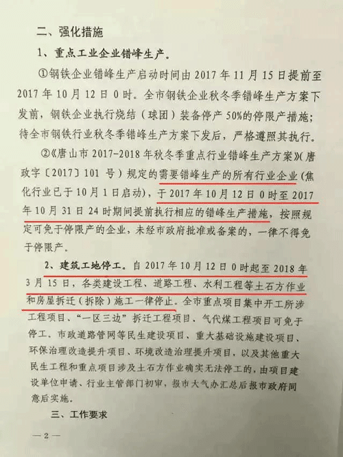 通知要求《唐山市2017-2018年秋冬季重點行業(yè)錯峰生產(chǎn)方案》(唐政字[2017]101號)規(guī)定的需要錯峰生產(chǎn)的所有行業(yè)企業(yè),于2017年10月12日0時至2017年10月31日24時期間提前執(zhí)行相應的錯峰生產(chǎn)措施,按照規(guī)定可免于停限產(chǎn)的企業(yè),未經(jīng)市政府批準或備案的,一律不得免于停限產(chǎn)。