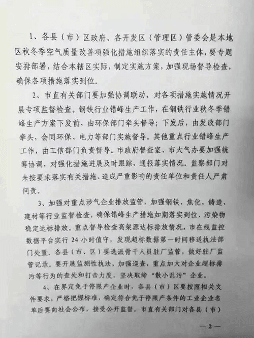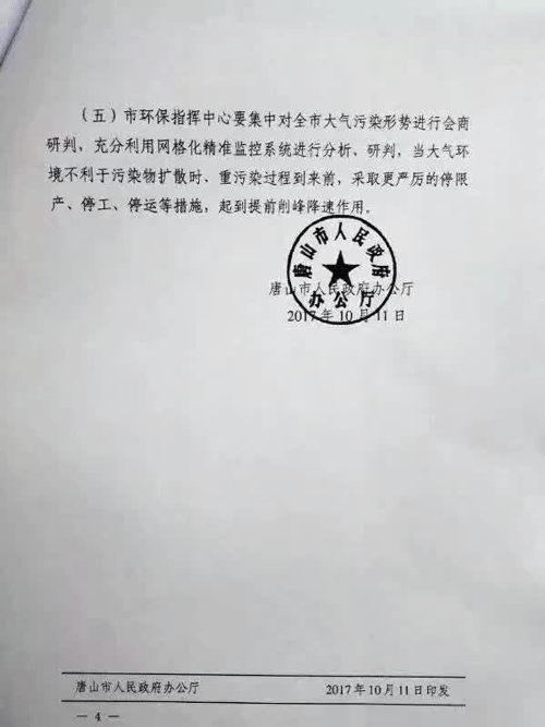 通知稱之所以提前啟動錯峰生產(chǎn)是因為十月份唐山市完成秋冬季大氣污染綜合治理攻堅目標形勢嚴峻,且經(jīng)預測10月13日、19日唐山市將經(jīng)歷重污染天氣過程。為確保完成國家、省下達的秋冬季空氣質量改善目標,經(jīng)唐山市政府研究決定,在十月份大氣污染綜合治理強化攻堅措施的基礎上,實施進一步的空氣質量改善強化措施。