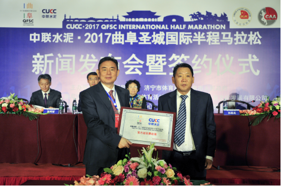 隨后,北京初美體育文化發(fā)展有限公司總經(jīng)理吳宇熙與中國聯(lián)合水泥集團(tuán)有限公司總經(jīng)理、黨委副書記孫建成簽約。中國聯(lián)合水泥集團(tuán)有限公司正式成為2017曲阜圣城國際半程馬拉松的獨(dú)家冠名商。濟(jì)寧市體育局副局長邵波為冠名贊助商中國聯(lián)合水泥集團(tuán)有限公司授牌。賽事獨(dú)家冠名商中國聯(lián)合水泥集團(tuán)有限公司總經(jīng)理、黨委副書記孫建成致辭。