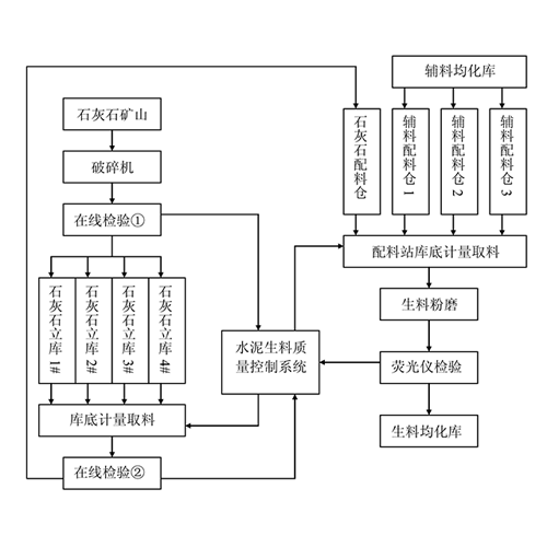 礦山石灰石經(jīng)破碎后進(jìn)行在線檢驗,按質(zhì)量的不同分別進(jìn)入四個(或多個)石灰石立庫,根據(jù)配料要求在庫底計量取料,傳送帶上在線檢驗,然后進(jìn)入石灰石配料倉,配料站庫底計量取料后,進(jìn)行生料粉磨、熒光儀檢驗,最后進(jìn)入生料均化庫。