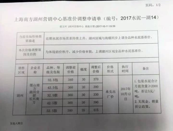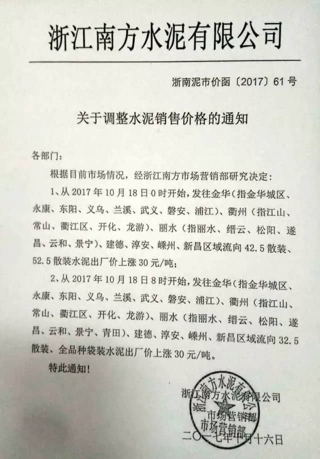 據(jù)悉,本次上調(diào)價格是由上海南方水泥領(lǐng)漲。上海南方水泥近期通知下屬企業(yè)及經(jīng)銷商稱:自2017年10月12日零時起,發(fā)往湖州區(qū)域的pc32.5R袋/散、po42.5袋/散水泥出廠價上調(diào)30元/噸;po52.5散水泥出廠價上調(diào)35元/噸。