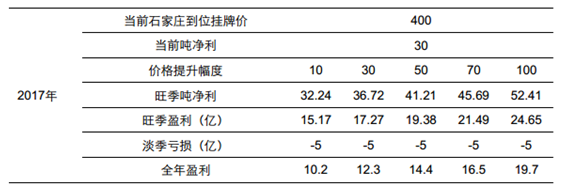 顯而易見(jiàn),考慮到水泥的區(qū)域性,京津冀的水泥企業(yè)最為受益雄安新區(qū)的建設(shè),主要標(biāo)的是冀東水泥和金隅股份,此外山西、遼寧、內(nèi)蒙也會(huì)受益。我們先對(duì)冀東水泥的盈利做彈性測(cè)算:1、考慮到淡旺季盈利水平的差異較大,我們做了淡季和旺季經(jīng)營(yíng)的一個(gè)拆分。其中11/12/1/2/3 定義為淡季;就 2016 年看,旺季估算盈利 7 億左右,淡季虧損 9 億左右(經(jīng)營(yíng)性利潤(rùn)表現(xiàn))。2、京津冀水泥價(jià)格 4 月初提漲 50 元,對(duì)應(yīng)的石家莊到位掛牌價(jià)在 400 元左右,類比去年 Q4,此價(jià)格下公司旺季的噸凈利在 30 元左右;3、我們?cè)谀壳?400 元的到位掛牌價(jià)基礎(chǔ)上做了測(cè)算,假設(shè)提價(jià) 10-100 元五個(gè)區(qū)間進(jìn)行測(cè)算,結(jié)果顯示,均價(jià)提升 30 元,公司有望實(shí)現(xiàn)旺季盈利 17 億元以上,考慮到淡季一定虧損,全年盈利有望在 12 億以上。4、按照此測(cè)算方法測(cè)算結(jié)果偏謹(jǐn)慎,實(shí)際盈利會(huì)比好于此,源于:第一,價(jià)格執(zhí)行到位的話, 400 元到位價(jià)對(duì)應(yīng)的噸凈利超過(guò) 30 元;第二,并沒(méi)有考慮外圍市場(chǎng)可能價(jià)格也會(huì)提升,尤其是山西和內(nèi)蒙等華北市場(chǎng);第三,沒(méi)有考慮需求量帶來(lái)的增長(zhǎng)。