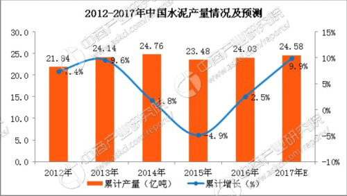 據(jù)中商產(chǎn)業(yè)研究院發(fā)布的《2017-2022年中國水泥行業(yè)市場前景及投資機(jī)會研究報(bào)告》數(shù)據(jù)統(tǒng)計(jì)顯示,2016年中國水泥累計(jì)產(chǎn)量為24.03億噸,累計(jì)增長2.5%;預(yù)計(jì)2017年中國水泥累計(jì)產(chǎn)量將達(dá)24.58億噸,累計(jì)增長約9.9%。據(jù)最新數(shù)據(jù)統(tǒng)計(jì)顯示,2017年9月中國水泥產(chǎn)量2.2億噸,同比下滑2%;2017年1-9月中國水泥產(chǎn)量17.6億噸,同比下滑0.5%。