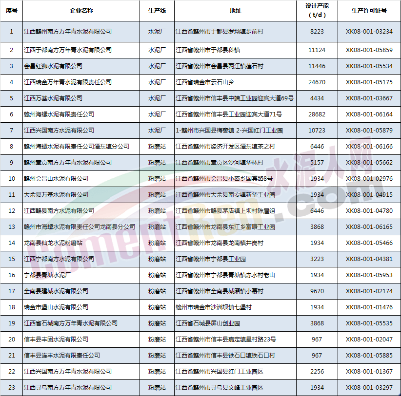 注:以上名單共23家,其中贛州海螺水泥有限責(zé)任公司、贛州海螺水泥有限責(zé)任公司潭東鎮(zhèn)分公司、贛州海螺水泥有限責(zé)任公司龍南縣分公司同屬贛州海螺水泥有限責(zé)任公司。