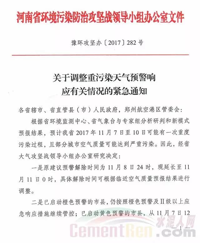 本次通知文件明確“原建議預(yù)警解除時間為11月8日24時,現(xiàn)延長至11月11日0時,具體解除時間可根據(jù)臨近空氣質(zhì)量預(yù)報結(jié)果進行調(diào)整。”,考慮到費用支出,節(jié)能降耗減排問題。省內(nèi)部分熟料生產(chǎn)線企業(yè)表示將會把此次重污染天氣管控停產(chǎn)與2017-2018年采暖季錯峰生產(chǎn)一并執(zhí)行,復(fù)產(chǎn)日期延期至2018年3月15日。