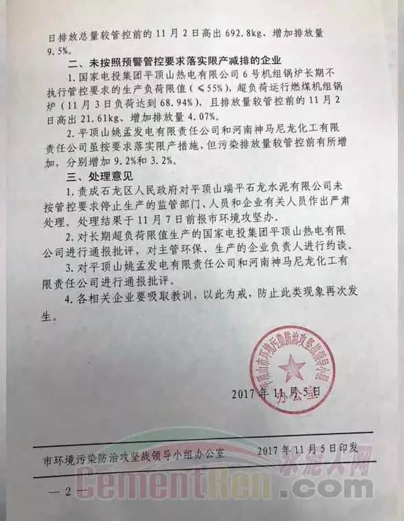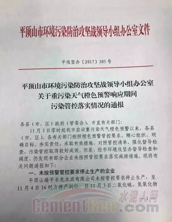 無獨(dú)有偶,平頂山市環(huán)境污染防治攻堅(jiān)戰(zhàn)領(lǐng)導(dǎo)小組辦公室日前通報(bào)了在11月3日零時(shí)啟動(dòng)重污染天氣橙色預(yù)警以后各縣(市、區(qū))未按照管控要求落實(shí)減排措施的企業(yè)和相關(guān)問題文件中稱:平頂山瑞平石龍水泥有限公司未按管控要求停止生產(chǎn),11月4日16時(shí)方停產(chǎn)到位。11月3日二氧化硫、氮氧化物日排放總量較管控前的11月2日高出692.8kg,增加排放量9.5%。
