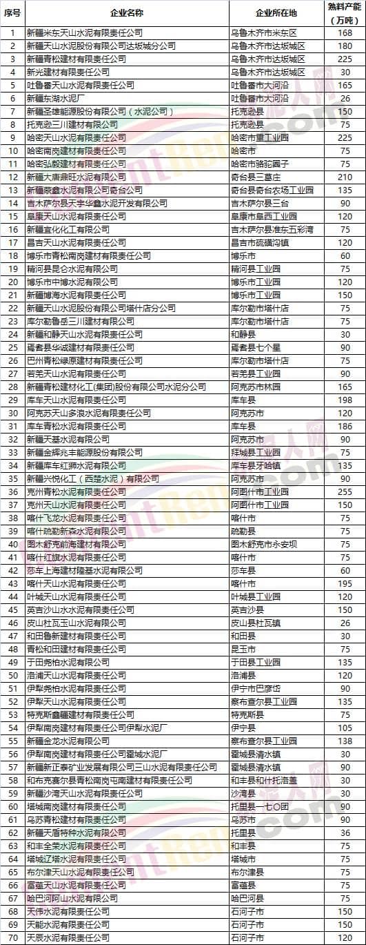 新疆水泥粉磨企業(yè)產(chǎn)能現(xiàn)狀清單