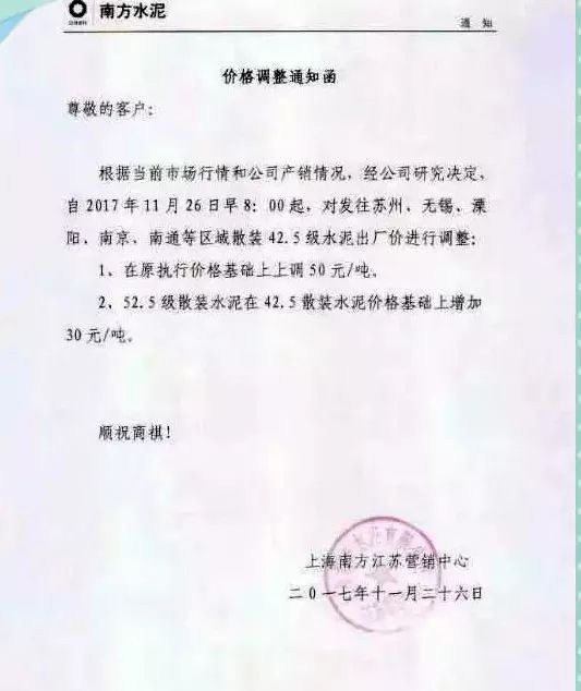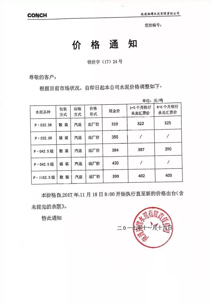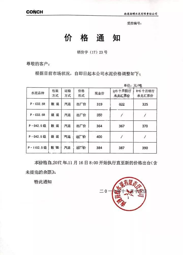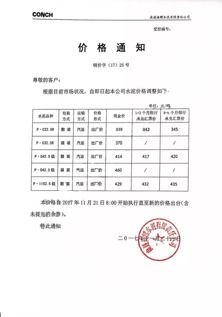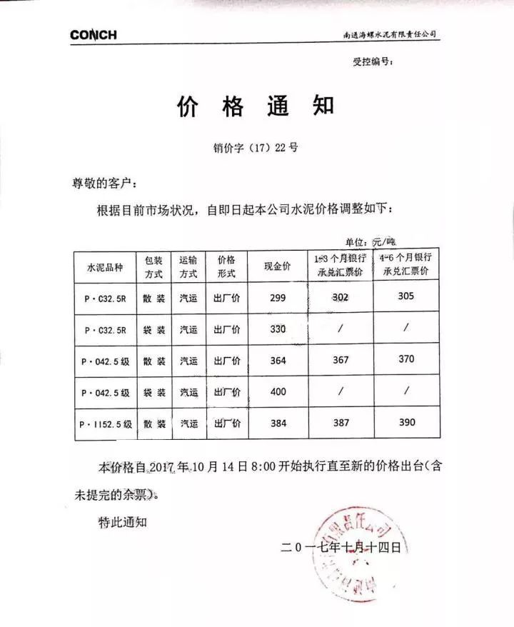 南通海螺水泥本月已經(jīng)五次發(fā)布提價(jià)通知,本月內(nèi)PO42.5散裝水泥漲近100元/噸。漲價(jià)通知如下: