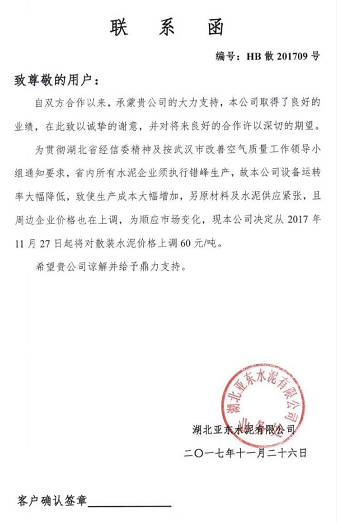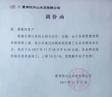 葛洲壩興山水泥有限公司《調價函》