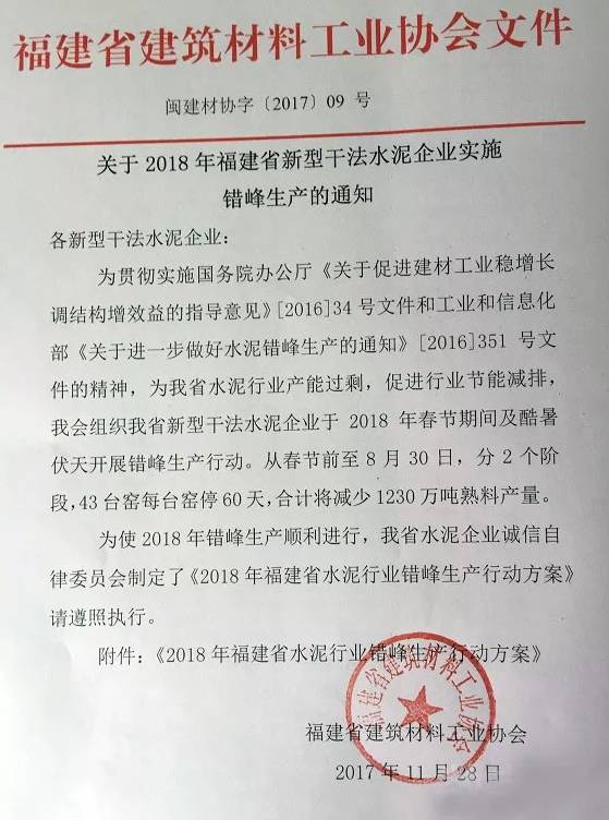 為使2018年錯峰生產(chǎn)順利進行,福建省水泥企業(yè)誠信自律委員會制定了《2018年福建省水泥行業(yè)錯峰生產(chǎn)行動方案》并請企業(yè)遵照執(zhí)行。