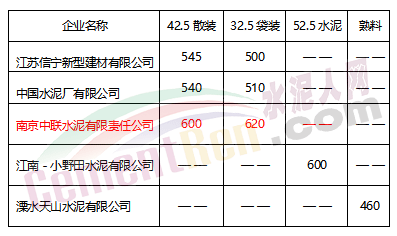 停限之后南京市本地水泥的出貨量銳減,水泥價格也出現(xiàn)一定的波動。截止小編發(fā)稿時止,南京市主導(dǎo)企業(yè)的PC32.5水泥,PO42.5水泥報價皆在500元以上。具體報價見下表: