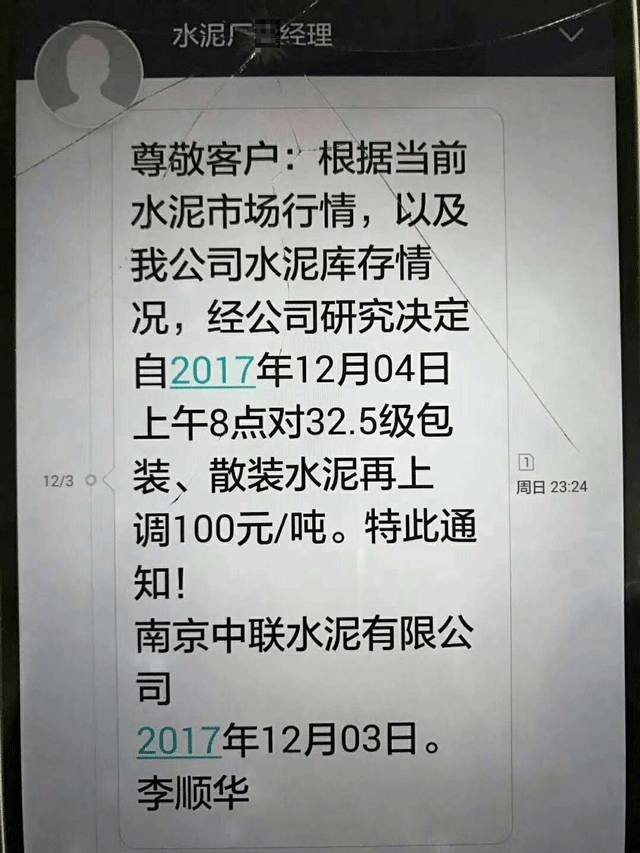 此前,南京中聯(lián)水泥有限公司發(fā)通知給下游客戶稱,根據(jù)當(dāng)前水泥市場行情,以及公司庫存情況,經(jīng)公司研究決定自12月4日上午8點起對32.5級包裝、散裝水泥上調(diào)100元/噸。上調(diào)后執(zhí)行的價格是32.5袋裝水泥620元/噸。