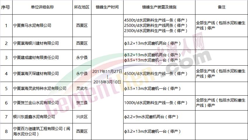 銀川市2017-2018年采暖期錯(cuò)峰生產(chǎn)