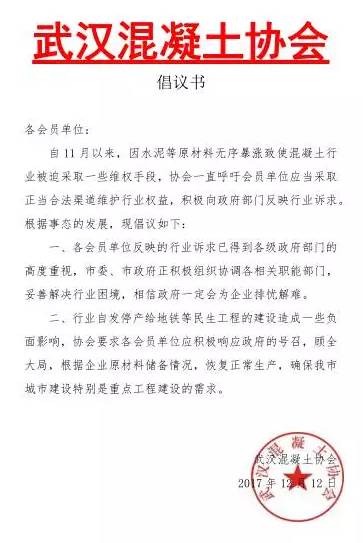 二、行業(yè)自發(fā)停產(chǎn)給地鐵等民生工程的建設(shè)造成一些負(fù)面影響,協(xié)會要求各會員單位積極響應(yīng)政府的號召,顧全大局,根據(jù)企業(yè)原材料儲備情況。恢復(fù)正常生產(chǎn),確保武漢市城市建設(shè)特別是重點(diǎn)工程的需求。