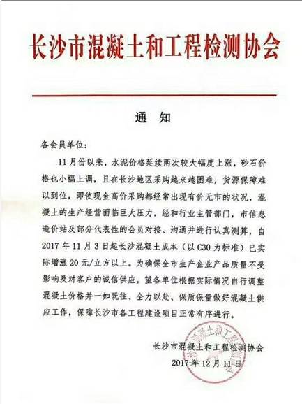 12月11日,湖南長沙市混凝土和工程檢測協(xié)會發(fā)布通知稱自11月份以來,水泥價(jià)格延續(xù)兩次較大幅度上漲,砂石價(jià)格也有小幅上調(diào),且在長沙地區(qū)采購越來越困難,貨源保障難以到位,即使現(xiàn)金高價(jià)采購都經(jīng)常出現(xiàn)有價(jià)無市的狀況,混凝土的生產(chǎn)經(jīng)營面臨巨大壓力,經(jīng)和行業(yè)主管部門,市信息造價(jià)站及部分代表性的會員對接、溝通并進(jìn)行認(rèn)真測算,自2017年11月3日起長沙混凝土成本(以C30為標(biāo)準(zhǔn))已實(shí)際增漲20元/立方以上。