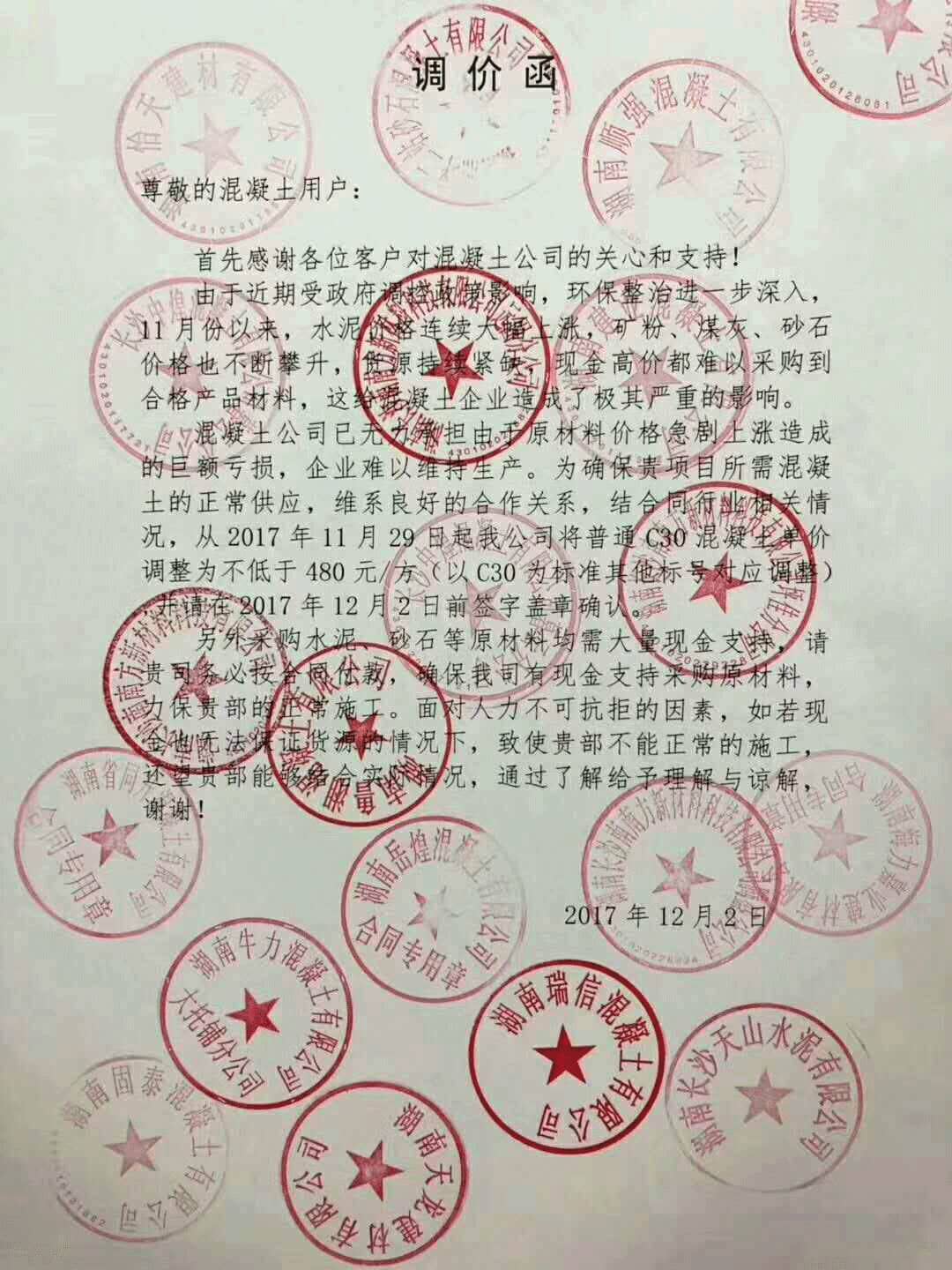 混凝土公司已無力承擔(dān)由于原材料價(jià)格急劇上漲造成的巨額虧損,企業(yè)難以維持生產(chǎn)。這確保項(xiàng)目所需混凝土的正常供應(yīng),維系良好合作關(guān)系,結(jié)合同行業(yè)相關(guān)情況自11月29日起將普通C30混凝土單價(jià)調(diào)整為不低于480元/方(以C30為標(biāo)準(zhǔn)其他標(biāo)號對應(yīng)調(diào)整),并在12月2日前簽字蓋章確認(rèn)。