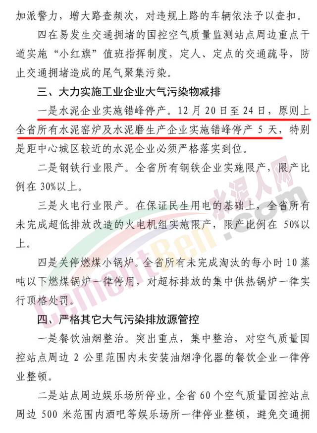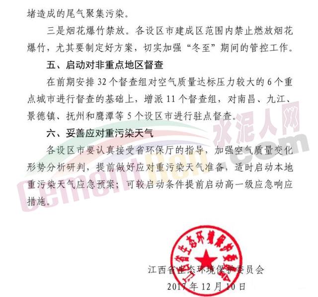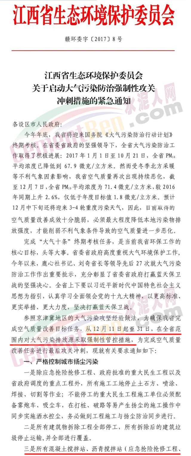 【水泥人網(wǎng)】近日,江西省生態(tài)環(huán)境保護(hù)委員會發(fā)布了關(guān)于啟動(dòng)大氣污染防治強(qiáng)制性攻關(guān)沖刺措施的緊急通知,通知要求參照京津冀地區(qū)的大氣污染攻堅(jiān)經(jīng)驗(yàn)作法,確保江西全省完成空氣質(zhì)量改善目標(biāo)任務(wù),從12月11日起至31日在全省范圍內(nèi)對大氣污染排放源采取強(qiáng)制管控措施。對所有混凝土攪拌站(應(yīng)急搶險(xiǎn)搶修工程、政府批準(zhǔn)的重大民生工程以及省政府調(diào)度的重點(diǎn)工程除外)全部停產(chǎn)。以水泥企業(yè)實(shí)施錯(cuò)峰停產(chǎn)。12月20日至24日,全省所有水泥窯爐及水泥磨生產(chǎn)企業(yè)實(shí)施錯(cuò)峰停產(chǎn)5天,特別是距中心城區(qū)較近的水泥企業(yè)必須嚴(yán)格落實(shí)到位。