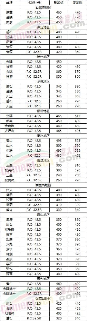 河北省部分地區(qū)水泥參考價(jià)