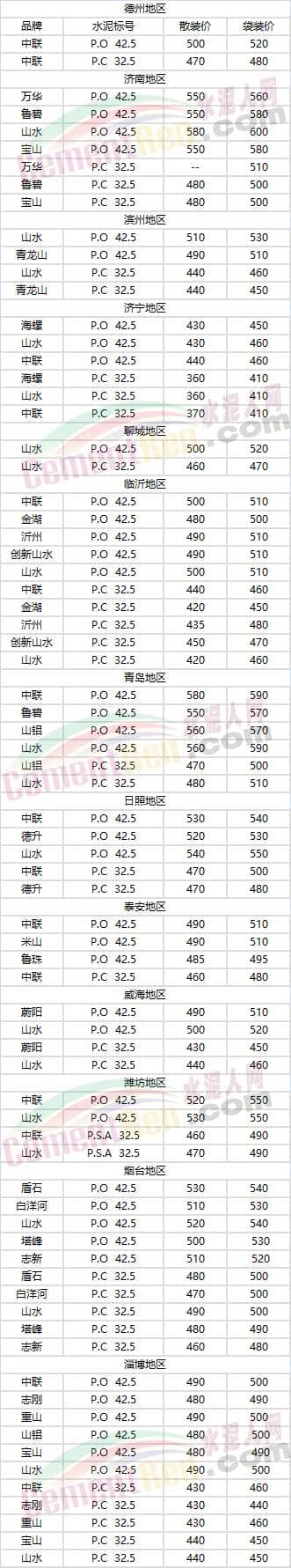 山東省部分地區(qū)水泥參考價(jià)