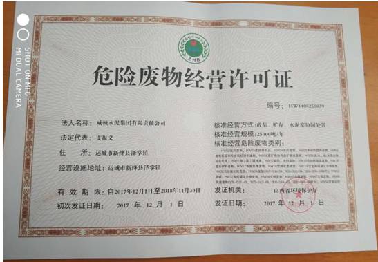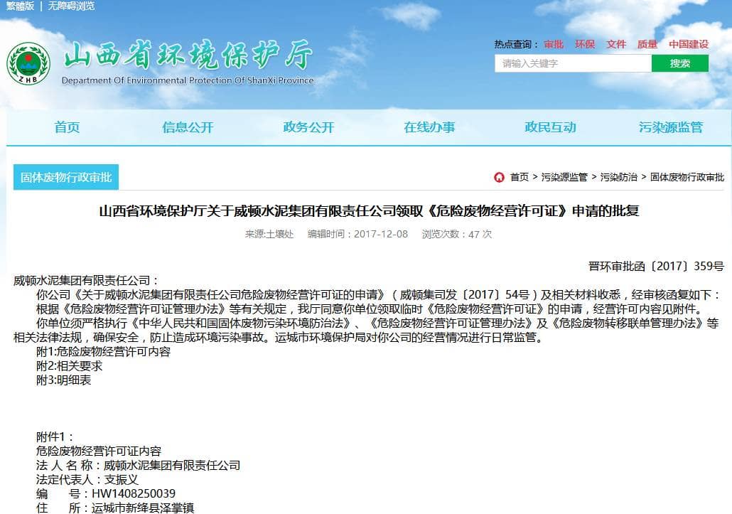 12月8日山西省環(huán)保廳在其官網(wǎng)上公開公布了關(guān)于威頓水泥集團(tuán)有限責(zé)任公司領(lǐng)取《危險廢物經(jīng)營許可證》申請的批復(fù)。